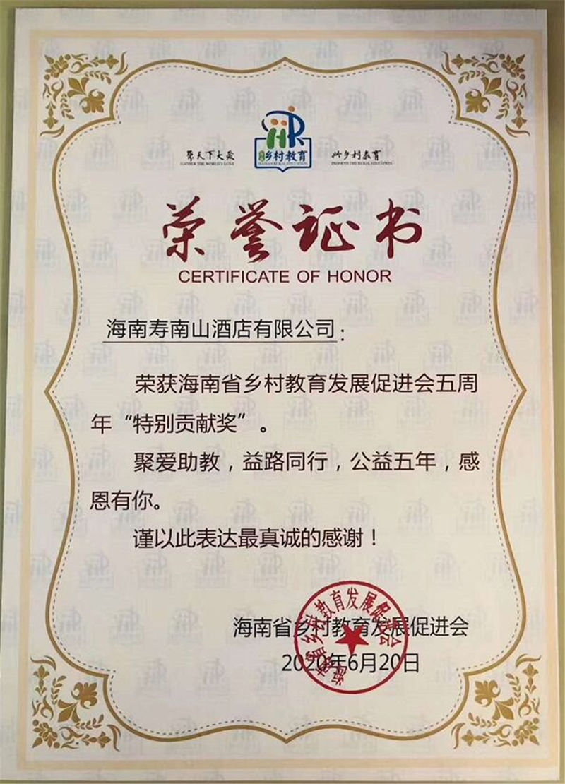 熱烈祝賀海南壽南山集團旗下的海南壽南山酒店有限公司再次榮獲由海南省鄉村教育發展促進會頒發的2020年海南省鄉村教育發展促進五周年“特別貢獻獎”。