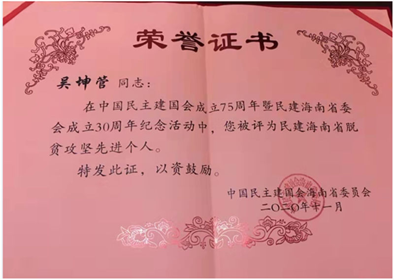 黨的十八大以來,在黨中央堅強領導下,在全黨全國全社會共同努力下,我國脫貧攻堅取得決定性成就,彰顯了中國共產黨領導和我國社會主義制度的政治優勢。這些成績的取得,凝聚了全黨全國各族人民智慧和心血,民企也貢獻了自己的力量。 脫貧攻堅是實施鄉村振興戰略的前提和基礎。只有如期實現現行標準下的農村貧困人口全部脫貧,才能實現全面建成小康社會的目標,才能為實施鄉村振興戰略打下堅實基礎。沒有農村貧困地區如期脫貧,就沒有鄉村振興。脫貧攻堅、擺脫貧困是鄉村振興的基礎和前提、是否能如期打贏脫貧攻堅戰,將深刻影響鄉村振興戰略實施的進程。 海南壽南山集團旗下的海南壽南山酒店管理有限公司總經理吳坤管先生在中國民主建國會成立75周年暨民建海南省委會成立30周年紀念活動中被評為 “脫貧攻堅先進個人”,這不僅是對吳坤管先生在脫貧攻堅工作中的肯定,更是對我們海南壽南山集團在履行社會責任與擔當的褒獎。